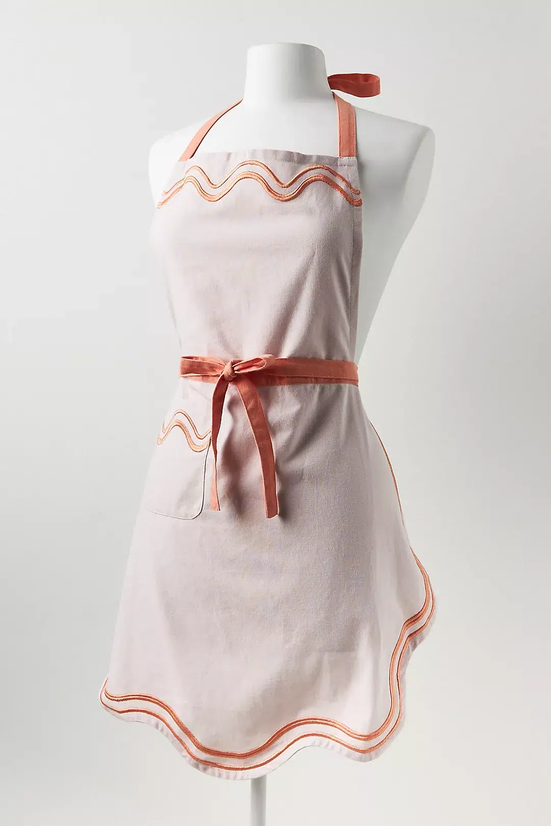 A unique scalloped edge apron with a pretty bow.