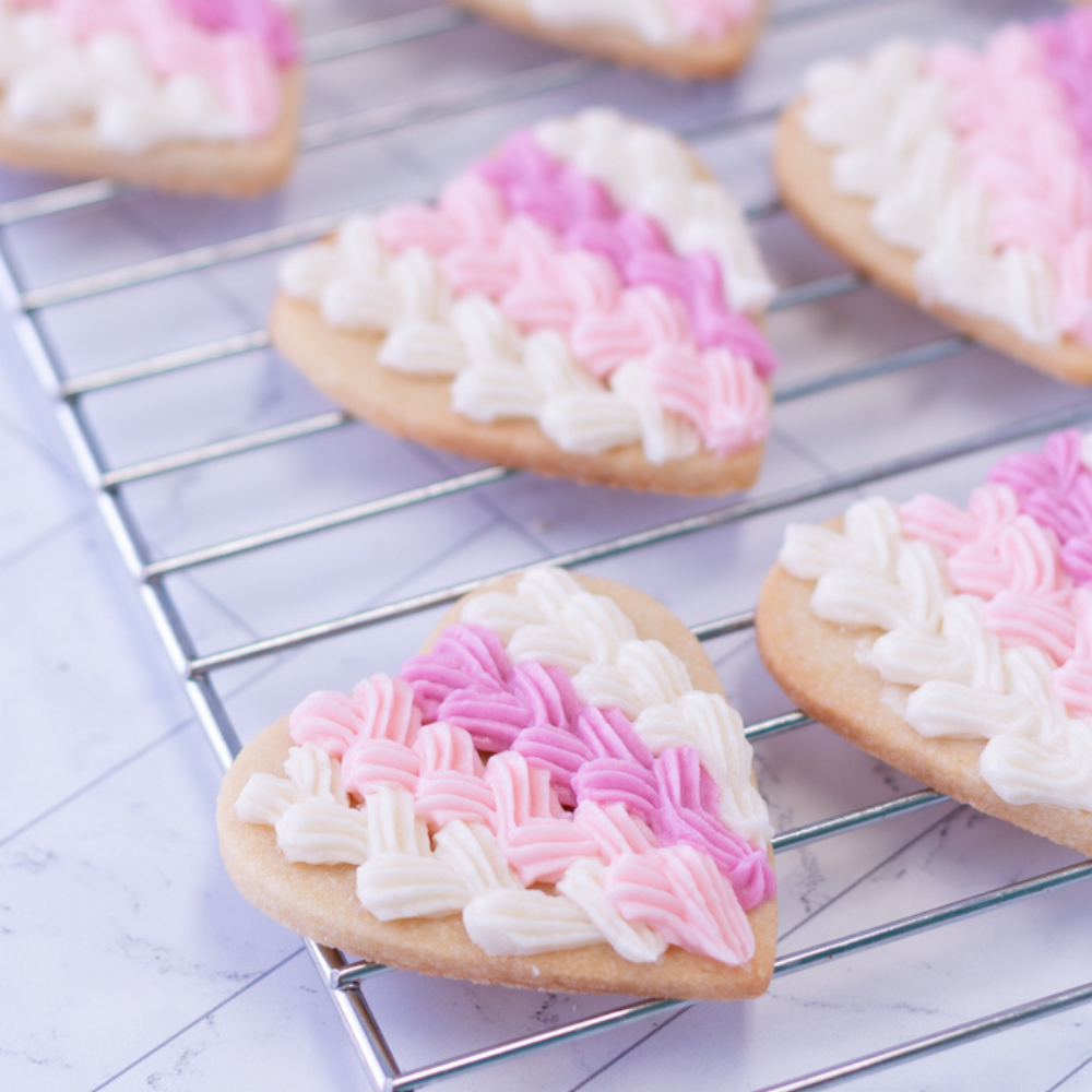 Sugar cookies don’t have to always be paired with royal icing! For these heart sugar cookies you can use my American buttercream recipe. Since the sugar cookies are buttery and not overly sweet, it won’t cause a big sugar rush to pair with American buttercream. Follow my easy American buttercream recipe here. (Tip: This braided shape is much easier to pipe with buttercream. If you really want to recreate this with royal icing, you need stiff consistency icing.)