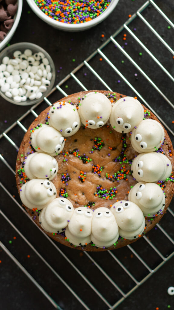 Turn this mini chocolate chip cookie cake into a festive Halloween dessert! This cookie cake has a crispy edge with a chewy center, piped with buttercream ghosts, edible candy eyes, and Halloween sprinkles.