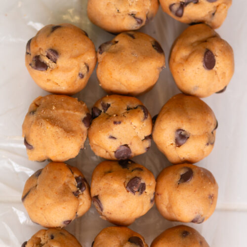 - Pumpkin chocolate chip cookie dough balls can be frozen for up to two months in an sealed freezer bag. Let them thaw overnight in the refrigerator before baking.