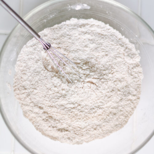 - Whisk the dry ingredients together in a medium sized bowl. Set aside.1 ½ cups all-purpose flour, ½ tsp baking soda, ½ tsp ground cinnamon, 2 tsp pumpkin pie spice, ¼ tsp kosher salt