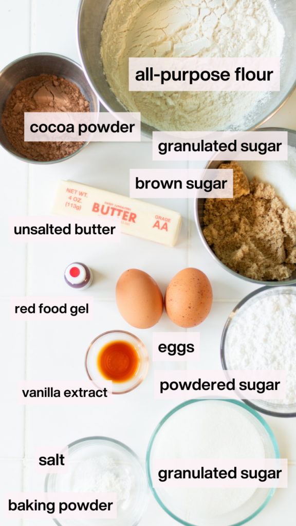 Let’s make some red velvet crinkle cookies! Make sure your butter and eggs are at room temperature before beginning.