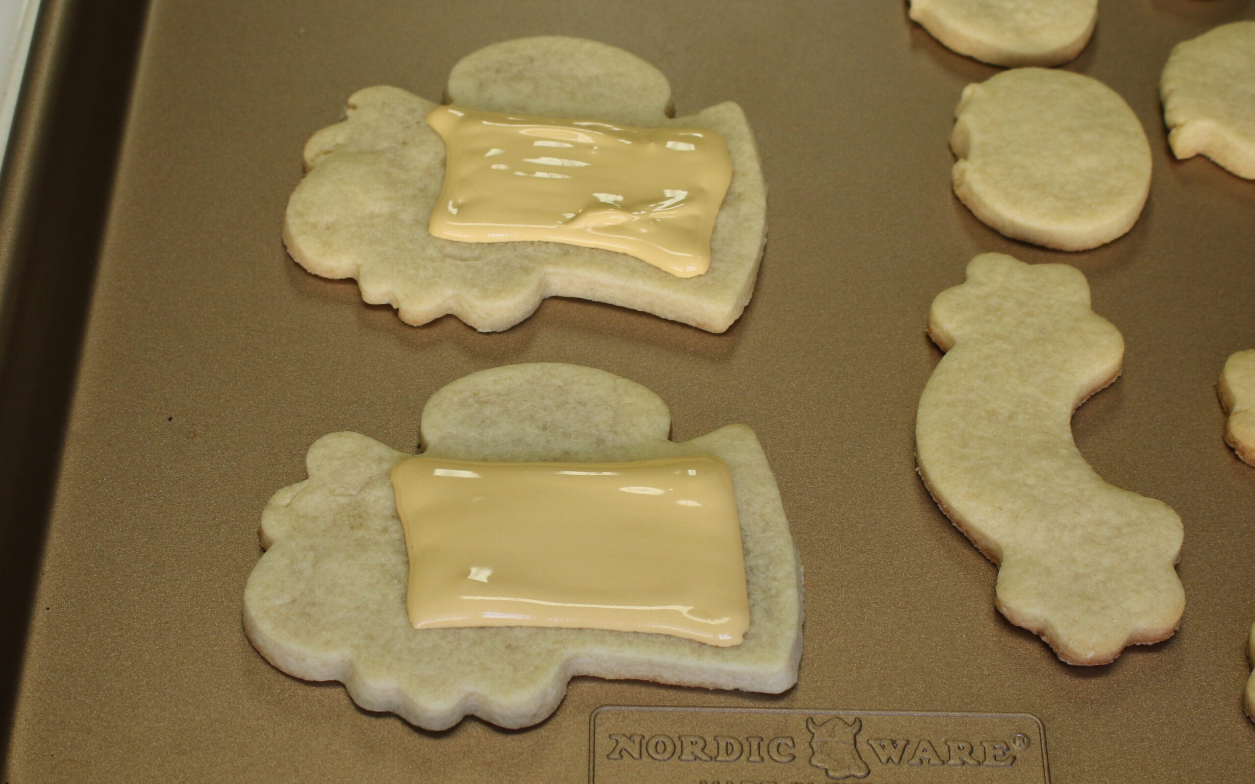 Use the tan medium consistency icing to pipe a rectangle outline and fill in.