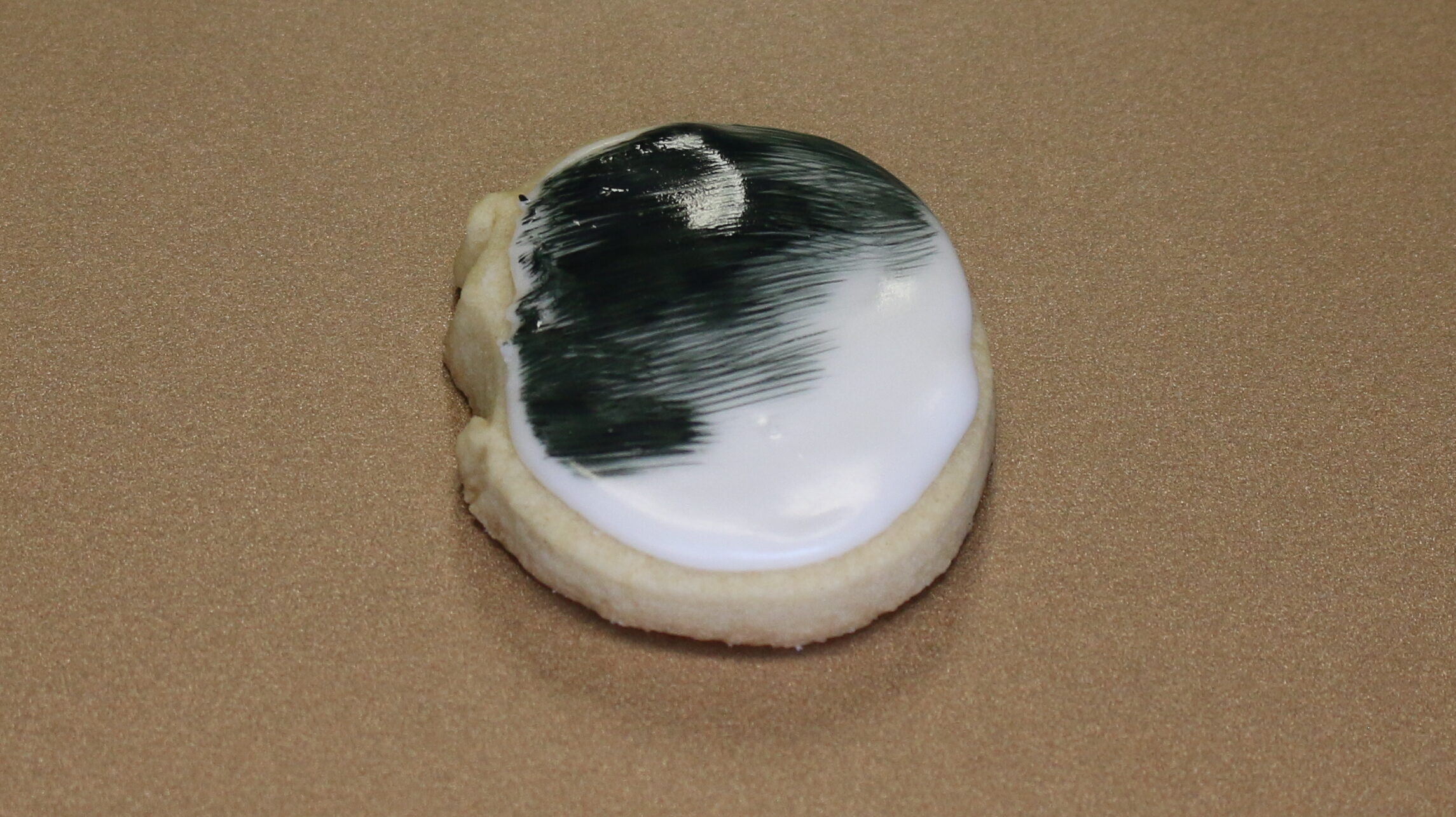 Add a drop of the gun metal dye onto a plate (kind of like paint!). Use an edible food brush and very gently brush the cookie with the dye. Remember that the drier the icing is, the less chance of breaking the thin top layer with pressure from painting.