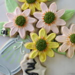 - Before the icing dries, pipe “stems” with the light green icing. This is called the wet on wet technique. The stems will look like they are in the vase inside of laying on top. Let this cookie dry for about 5 minutes.