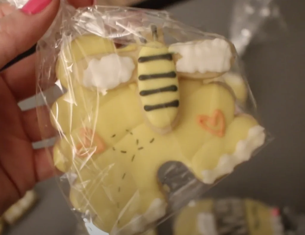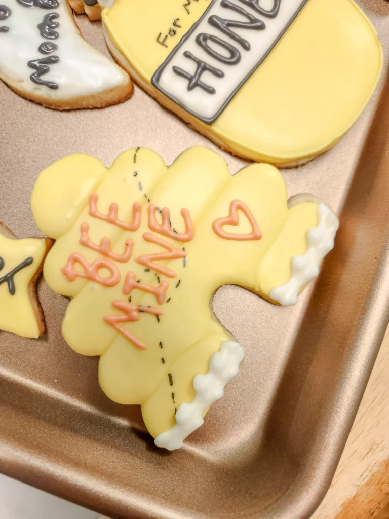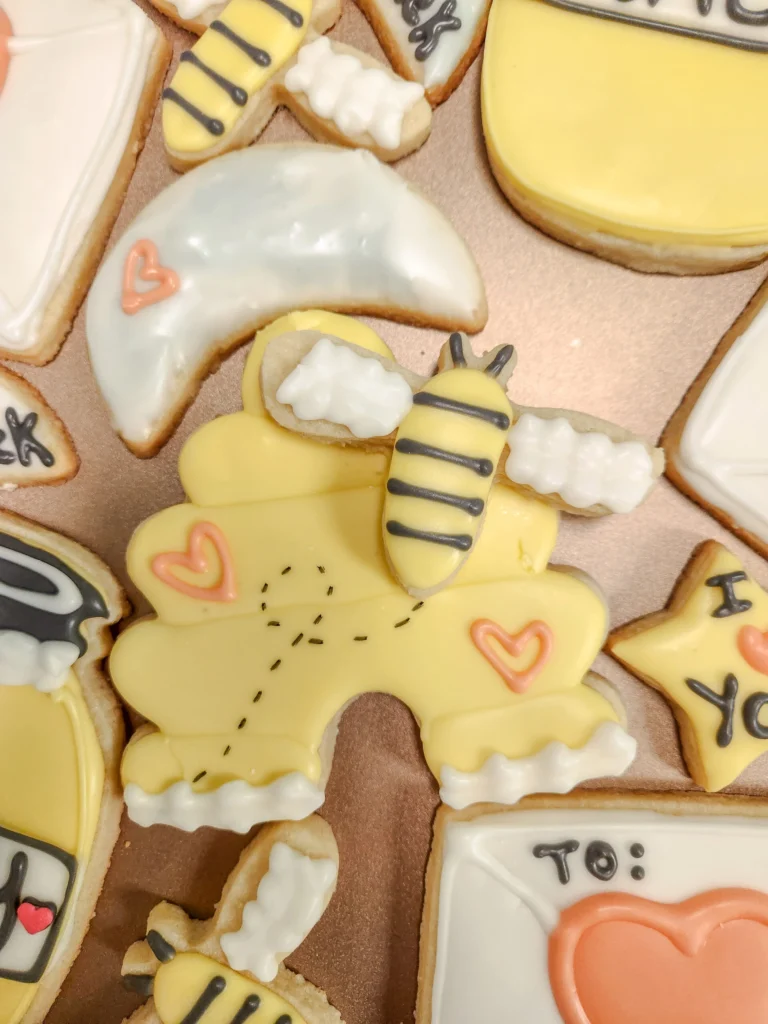 Glue the little bee cookies onto the beehive or the honey jar with leftover royal icing to create a 3D cookie.