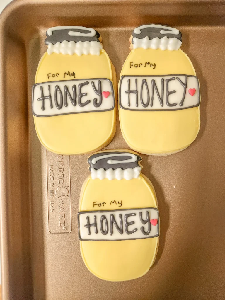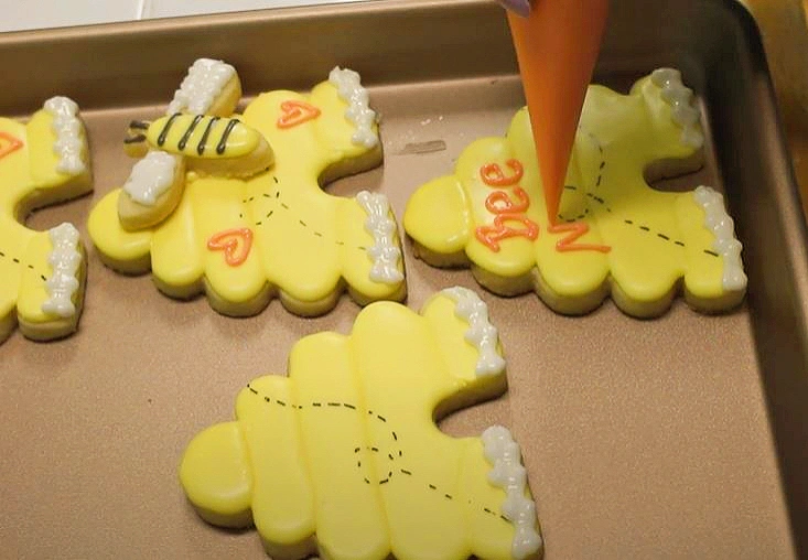 - Take the stiff black icing and slowly write HONEY using long up and down strokes.