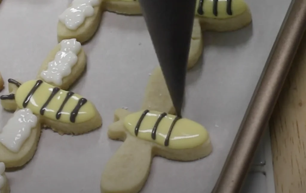 - After the icing is dry to the touch, use a light hand to draw “bee line” designs with the edible food marker.