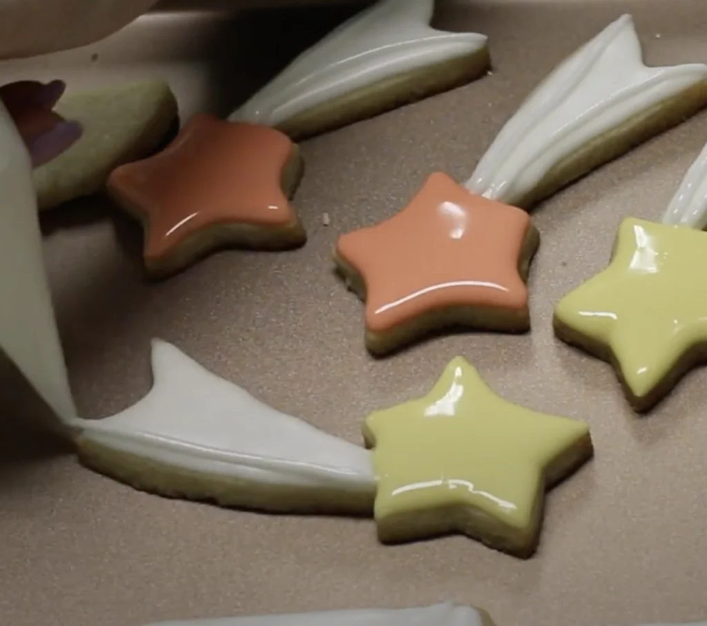 - Outline the shooting star tail with white medium consistency icing, then fill in and let this dry.