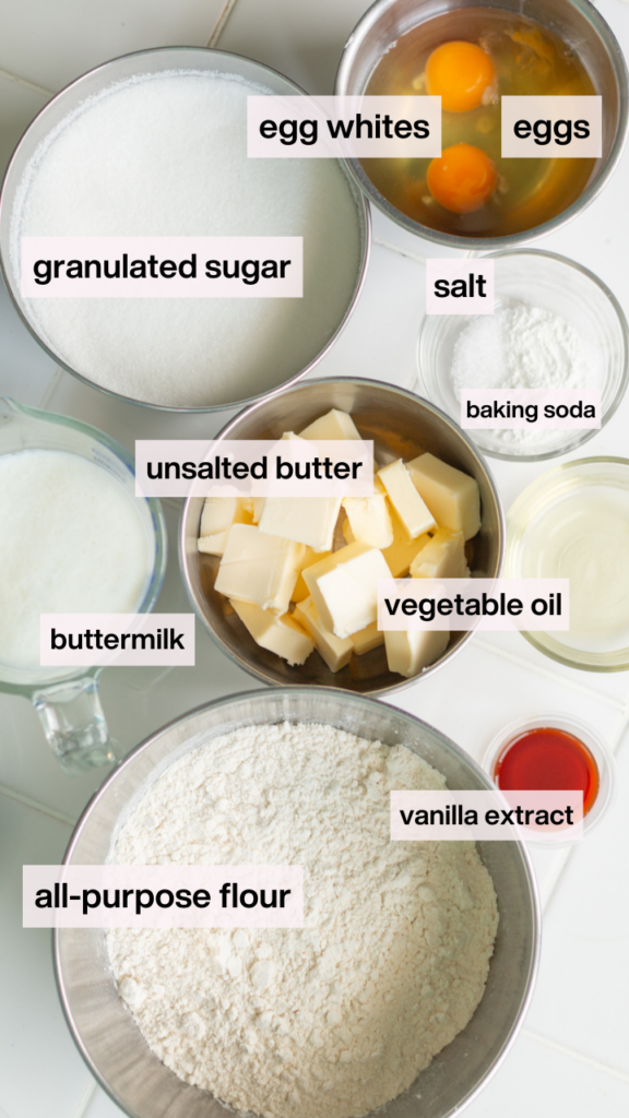 buttermilk (the secret!!): adds extra moisture, a tangy flavor, softer cake crumb, and is the acid that interacts with baking soda to help the cake rise